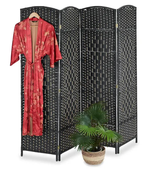 4 Panel Wooden Room Divider – Flexible Privacy Screen with Woven Rattan (Black)